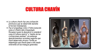 La cultura Chavín se desarrolló entre 1200 a. C. y 500 a. C. en la sierra norte del Perú. Construyeron el centro ceremonial de Chavín de Huántar, que incluía templos subterráneos con esculturas monolíticas que representaban deidades. Practicaron la agricultura, la ganadería de camélidos, y destacaron en la orfebrería, textilería, cerámica y escultura. Adoraron a dioses con rasgos de animales de la selva como jaguares y cóndores.