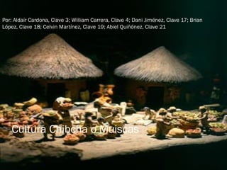 Los muiscas constituían una sociedad agrícola y artesanal que habitó el altiplano cundiboyacense de Colombia desde el siglo VI a.C. Adoraban dioses como el Sol, la Luna y Bochica. Cultivaban maíz, papa y otros productos, y comerciaban con pueblos vecinos intercambiando mantas, sal, cerámicas y esmeraldas. Aunque su cultura desapareció tras la conquista española, algunos de sus descendientes aún viven en la región de Bogotá.