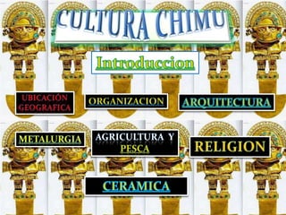 La cultura Chimú se desarrolló entre los años 900-1470 d.C. en el norte de Perú, con su capital en la ciudad de Chan Chan. Los Chimús formaron un extenso reino a lo largo de la costa norte, entre Tumbes y el valle de Lima. Su sociedad estaba organizada en torno a un poderoso rey y una élite gobernante, y se sustentaba principalmente de la agricultura, la pesca y el comercio. La arquitectura Chimú se caracterizó por sus grandes ciudades de barro, dest
