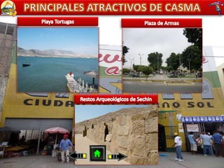 El documento proporciona información sobre varios lugares y eventos en la región de Ancash, Perú. Menciona sitios turísticos como Casmahuarymey, Baños Termales de Monterrey y el Mirador de Rataquenua. También describe festividades religiosas y culturales como el Carnaval Huaylino en Caraz y la Fiesta Patronal de la Virgen de las Mercedes en Huaraz. Además, resalta la gastronomía típica de la zona que incluye platos como el pecan caldo y la pach