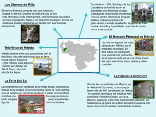 Este documento proporciona información sobre varios lugares de interés en la ciudad de Mérida, Venezuela. Menciona el Parque Los Chorros de Milla, conocido por sus cascadas y lagos. También habla del Teleférico de Mérida, el teleférico más alto del mundo, y la Feria del Sol, una feria taurina que se celebra anualmente. Además, brinda detalles sobre el Mercado Principal de Mérida y la Heladería Coromoto, reconocida por tener más de 600 variedades de helado.