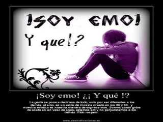 El movimiento emo surgió en la década de 1980 como un subgénero musical post-hardcore con letras emocionales. Con el tiempo, los seguidores de este estilo musical desarrollaron una subcultura basada en la expresión de emociones como la tristeza y el dolor. Aunque originalmente estaba asociado con bandas punk e independientes, en los años 90 el término "emo" se popularizó y pasó a describir un estereotipo juvenil caracterizado por el peinado, la ropa oscura y actitudes pesimistas.