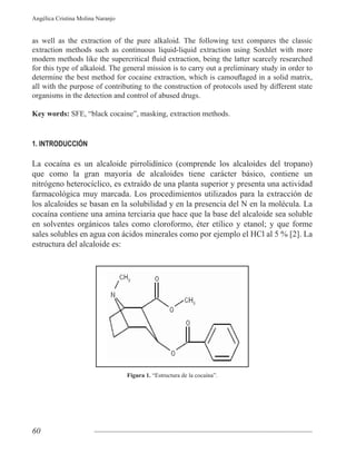 El documento compara diferentes métodos de extracción para recuperar cocaína previamente incorporada a una matriz sólida. Describe métodos clásicos como la extracción líquido-líquido continua usando Soxhlet y métodos más modernos como la extracción con fluidos supercríticos. Realiza una serie de análisis cualitativos preliminares para determinar el mejor procedimiento experimental, incluyendo extracciones con agua, etanol y cloroformo. Finalmente, aplica diferentes métodos de extracción como Soxhlet y CO2 supercrítico para optimizar la rec