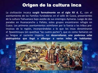 El documento resume la civilización inca. Los incas se asentaron en el valle de Cusco en el siglo XII d.C. y desarrollaron un poderoso imperio, el Tahuantinsuyu, que se extendió por los Andes de Colombia a Argentina. La sociedad inca estaba dominada por el Inca como líder divino y tenía una estructura jerárquica basada en la nobleza, sacerdotes, jefes locales y comunidades agrícolas. La economía se centraba en la agricultura de cultivos como maíz y papas mediante
