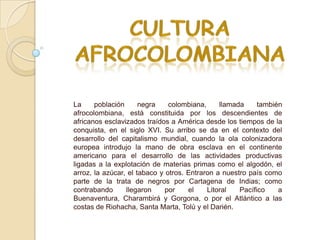 El documento habla sobre la afrocolombianidad. Describe la llegada de los africanos esclavizados a Colombia y algunas de sus tradiciones culturales como la música, bailes, comidas y literatura afrocolombianas. Menciona danzas como el currulao, bundes y mapalé, así como platos típicos como el chere, coyano y leche de mil pesos. También destaca a escritores afrocolombianos pioneros como Candelario Obeso y Juan José Nieto Gil.