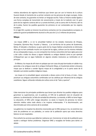 La declaración de las Naciones Unidas de 2007 reconoció una serie de derechos a los pueblos indígenas, incluidos el derecho a no ser discriminados y a mantener sus propias instituciones políticas, económicas y culturales. El documento describe varios pueblos indígenas que participaron en la declaración, como los quechuas, aimaras, guaraníes y mayas, detallando aspectos de su cultura, lengua e historia. También señala problemas actuales como la pobreza, la falta de alimentos y atención mé