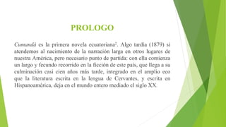 Esta novela cuenta la historia de amor entre Carlos Orozco y Cumandá, una joven indígena, en la selva ecuatoriana de finales del siglo XVIII. Cumandá es hija de un guía indígena y debe participar en un ritual para ser esposa de un jefe de la tribu, llevando a Carlos a pesar de los peligros. Los hermanos de Cumandá quieren matar a Carlos pero ella lo protege. Al final se descubre que Cumandá y Carlos son hermanos, separados por una tragedia en el pasado