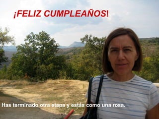 Este documento felicita a alguien por su cumpleaños y por terminar otra etapa de su vida. Desea que continúe con su sonrisa y buen humor, y que tenga éxito en la nueva etapa como secretaria. Aunque aparezcan dificultades, la persona que escribe el mensaje estará allí para apoyarlo y celebrar momentos felices juntos, mientras siguen caminando por la vida.