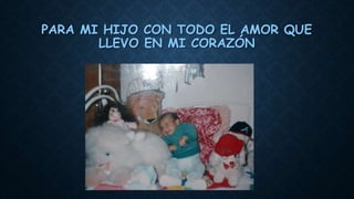La madre escribe una carta de amor a su hijo expresando su deseo de poder quitarle todo su sufrimiento y sentirlo ella en su lugar. Recuerda con cariño cuando supo que estaba embarazada y lo mucho que lo amó incluso antes de conocerlo. Agradece las lecciones de valor, esfuerzo y alegría que su hijo le ha enseñado, y le desea lo mejor siempre contando con su amor y el de su familia.