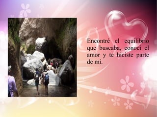El documento es una carta de amor de un hombre a su esposa por su cumpleaños. El expresa cómo ella llegó a su vida y cambió todo, le dio equilibrio y amor. Agradece a Dios por ponerla en su camino y dejar que sea su compañera. La ama por ser la mujer que es y por impulsarlo a seguir adelante a pesar de los momentos felices y tristes. Aunque no puede estar con ella físicamente, su corazón y alma están con ella. También expresa su agradecimiento por el hijo