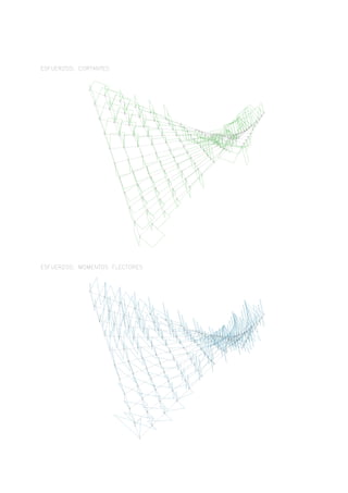 Este documento analiza diferentes tipologías estructurales como bóvedas, láminas, cúpulas y paraboloides. Explica el funcionamiento estructural y cálculo de bóvedas cilíndricas y cúpulas. Las bóvedas trabajan a compresión como arcos, mientras que las láminas cilíndricas funcionan más como vigas sometidas a flexión y tracción. Las cúpulas distribuyen las cargas a través de anillos y meridianos que trabajan juntos en compresión y tracción. Tamb