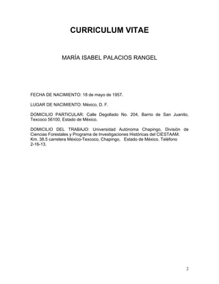 Este documento presenta el currículum vitae de María Isabel Palacios Rangel. Detalla su educación formal que incluye licenciaturas en Artes Visuales y Antropología Social, así como una maestría en Desarrollo Rural. También enumera sus publicaciones, proyectos de investigación y dirección de tesis sobre temas relacionados con la historia agrícola y rural de México. Finalmente, presenta su experiencia laboral en la Universidad Autónoma Chapingo.
