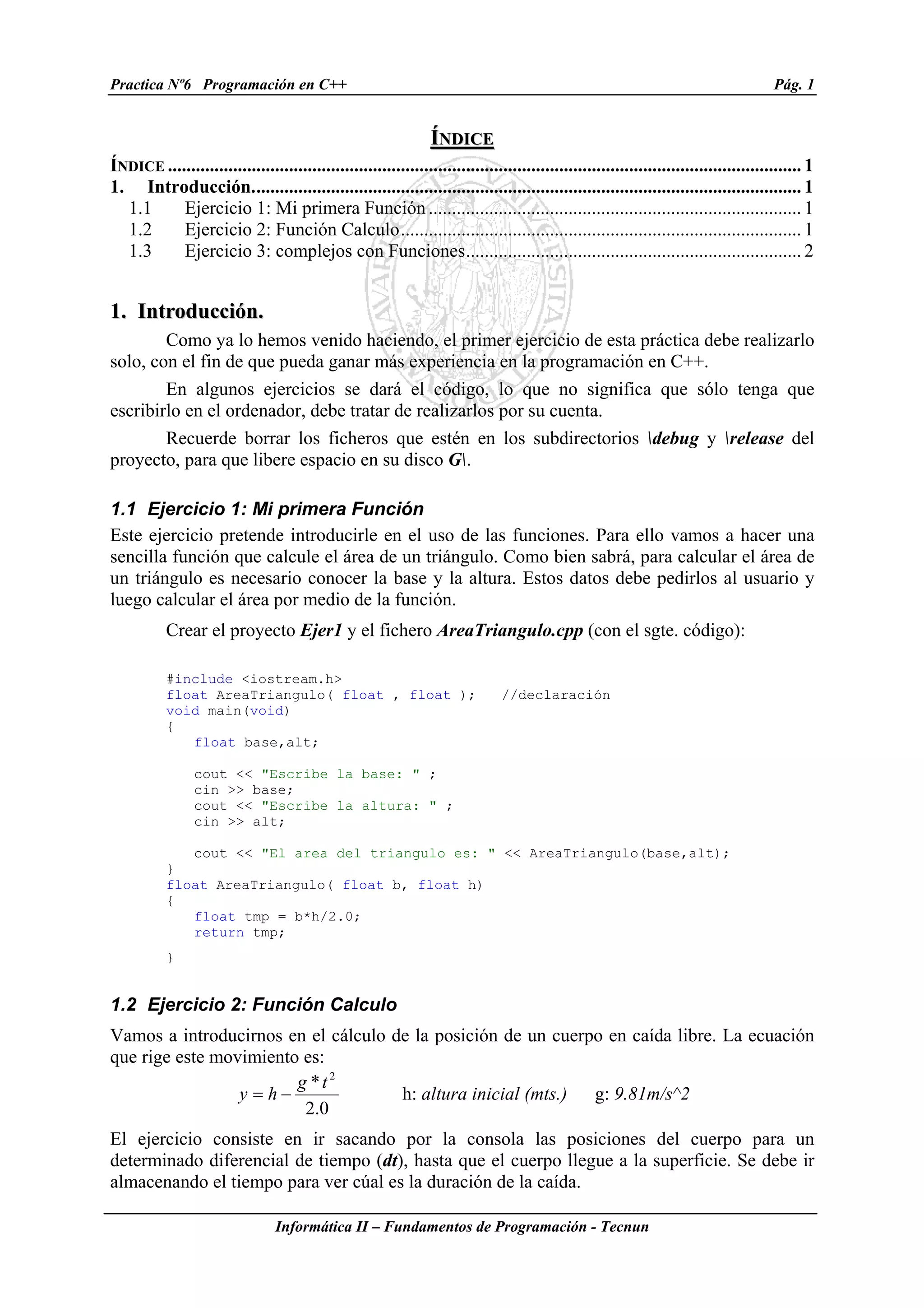 Este documento presenta tres ejercicios de programación en C++ que involucran el uso de funciones. El primer ejercicio pide crear una función para calcular el área de un triángulo. El segundo ejercicio modela la caída libre de un cuerpo usando una función para calcular su posición en intervalos de tiempo. El tercer ejercicio suma, resta, multiplica y divide números complejos a través de funciones, dando una interfaz de menú al usuario.
