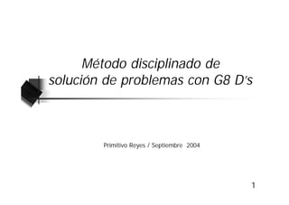 D1 establece el equipo para resolver el problema. El equipo debe incluir a personas conocedoras del proceso y producto, tener autoridad para tomar decisiones, y representar la perspectiva del cliente. Se designa un líder y un campeón del equipo. El enfoque de equipo incluye guias para participación efectiva en las reuniones.
