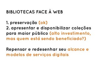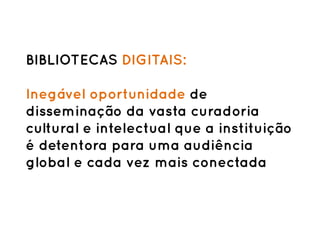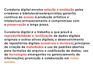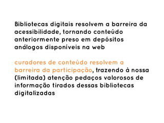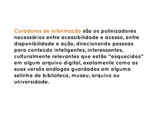El documento habla sobre la cultura digital, la participación pública y la colaboración de todos para el beneficio de todos a través de la curaduría digital y dominio público de una manera justa y sin prejuicios en Brasil.