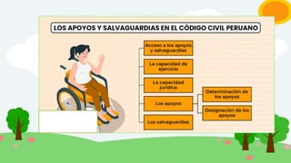 El documento habla sobre la curatela y los apoyos y salvaguardias para personas con capacidad de ejercicio restringida según el Código Civil peruano. Explica que la curatela es una institución que protege a personas que no pueden ejercer plenamente sus derechos, como pródigos, ebrios o personas con discapacidad. También introduce el concepto de "apoyos", que son formas de asistencia voluntaria para facilitar el ejercicio de derechos de personas mayores de edad.