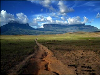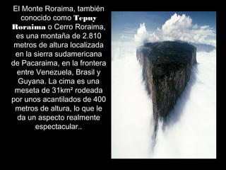 El Monte Roraima es una montaña de 2.810 metros de altura localizada en la frontera entre Venezuela, Brasil y Guyana. Su cima plana de 31km2 está rodeada por acantilados de 400 metros y recibe casi lluvia diaria, lo que alimenta numerosas cascadas. Fue descrito por primera vez en 1596 y sirvió de inspiración para la novela de Arthur Conan Doyle "El Mundo Perdido".