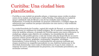 Curitiba es una ciudad brasileña bien planificada con grandes zonas verdes y un excelente sistema de transporte público. La ciudad ha desarrollado un proyecto urbano y ecológico a lo largo de 30 años bajo la dirección del arquitecto Jaime Lerner, creando un sistema de parques y un sistema de transporte público eficiente basado en autobuses. Curitiba es considerada una de las ciudades más limpias y con mejor calidad de vida en Sudamérica.