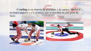 El curling es un deporte de equipo que se juega sobre una pista de hielo donde los jugadores usan piedras de granito para deslizarse hacia una diana. Se cree que el curling se originó en Escocia en la Edad Media y ahora se practica en muchos países. Un partido típico consta de 10 rondas llamadas "ends" donde cada equipo lanza 16 piedras con el objetivo de dejarlas más cerca del centro de la diana que el equipo contrario.