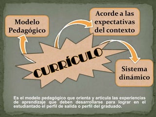 El documento presenta los elementos clave de un modelo pedagógico para orientar las experiencias de aprendizaje de los estudiantes. Explica que el modelo debe articular los propósitos, contenidos, métodos, evaluación y conclusión del proceso educativo. Detalla que los propósitos deben expresar los resultados del aprendizaje, los contenidos deben organizarse en bloques y destrezas, los métodos deben especificar estrategias didácticas, y la evaluación debe medir el desempeño y logros de los estudiantes. Concluye que el estudio