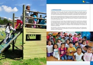El documento presenta el currículo de educación inicial 2014 de Ecuador. Explica que el currículo surge para garantizar una educación de calidad e igualdad de oportunidades para todos los niños. Resume los antecedentes legales que establecen el derecho a la educación inicial y los referentes curriculares previos en el país. También describe las bases teóricas del diseño curricular, incluyendo los aportes de Vigotsky sobre la importancia del entorno y la mediación de adultos en el aprendizaje y desarrollo de los niños.