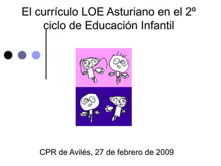 El documento presenta un resumen del currículo LOE para el segundo ciclo de Educación Infantil en Asturias. Explica el marco legal, la identidad de la etapa, el modelo educativo asturiano, los objetivos, contenidos, criterios de evaluación y orientaciones metodológicas. Se enfatiza el enfoque basado en el juego, la cooperación con familias, y la importancia de crear un clima de bienestar e igualdad de trato.