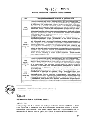 El documento presenta el programa curricular de Educación Inicial del Ministerio de Educación de Perú. Describe que el nivel de Educación Inicial atiende a niños menores de 6 años y consta de dos ciclos: el primer ciclo para niños de 0 a 2 años, y el segundo ciclo para niños de 3 a 5 años. Explica las características del desarrollo de los niños en cada ciclo y cómo se aborda la atención educativa, resaltando la importancia del juego, la exploración y los vínculos afect