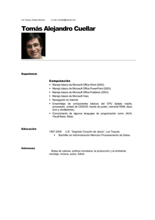 Tomás Alejandro Cuellar presenta su experiencia en computación, incluyendo el manejo básico de Microsoft Office, navegación en Internet, y ensamblaje de componentes de CPU. También describe su educación como bachiller en administración con mención en procesamiento de datos de la U.E. "Sagrado Corazón de Jesús" en Los Teques. Finalmente, menciona sus intereses en bolsa de valores, política monetaria, producción ambiental, reciclaje, música, autos y fútbol.