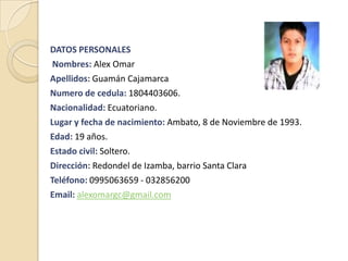 Este documento presenta el currículo vitae de Alex Guamán, un estudiante de segundo año de ingeniería mecánica en la Universidad Técnica de Ambato. Incluye su información personal, educación, experiencia laboral en calzamatriz y fundiciones, habilidades en diseño, construcción y soldadura, y referencias personales y laborales.