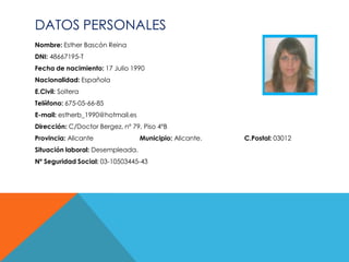Este documento presenta los datos personales, formación académica y complementaria, habilidades e información adicional sobre Esther Bascón Reina. Incluye detalles como su nombre, fecha de nacimiento, dirección, estudios completados y en curso, cursos complementarios, nivel de inglés y valenciano, habilidades informáticas y su situación actual como desempleada.