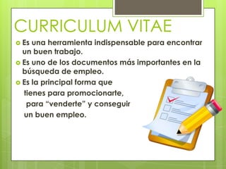 Este documento explica la importancia y contenido de un currículum vitae. Un currículum vitae es una herramienta indispensable para encontrar trabajo y promocionarse. Debe incluir información personal, educación, experiencia laboral, y otras actividades. Se recomienda diseñarlo de manera clara, concisa y actualizada para causar una buena impresión a los posibles empleadores.