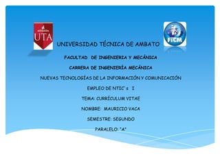 Este documento es el currículum vitae de Mauricio Vaca, un estudiante de segundo semestre de ingeniería mecánica en la Universidad Técnica de Ambato. Incluye sus datos personales, formación académica en la escuela primaria y secundaria, experiencia laboral en un taller mecánico, y seminarios universitarios sobre seguridad industrial, hardware y software, e ingeniería ambiental. También proporciona referencias de ingenieros mecánicos, electromecánicos e industriales.