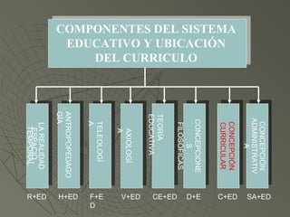 Este documento discute los componentes del sistema educativo y la ubicación del currículo. Explica que el currículo se refiere al plan de estudios y experiencias educativas diseñadas para los estudiantes. Define el currículo como singular y la currícula como plural, y enumera tres denominaciones posibles dependiendo de si su elaboración es a nivel nacional, regional o de institución educativa. Finalmente, detalla varios términos relacionados con el diseño curricular como plan curricular, estructura curricular básica, plan de estudios, líneas de