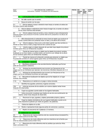 Este documento parece ser un cuadernillo de evaluación para evaluar el desarrollo de un niño o niña en diferentes áreas como la visión, la motricidad, la resolución de problemas, el vocabulario, entre otras. Contiene una lista de secuencias de conducta divididas por edades en meses y un espacio para anotar la fecha en que el niño demuestra haber superado cada secuencia. El objetivo es llevar un registro del progreso del niño a lo largo del tiempo.
