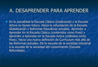 El documento trata sobre un nuevo paradigma de aprendizaje y enseñanza basado en aprender a aprender, desarrollando capacidades, destrezas, valores y actitudes. Propone un modelo de diseño curricular centrado en objetivos de aprendizaje, contenidos, métodos y evaluación formativa, con el profesor como mediador del aprendizaje.