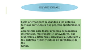 El documento describe las orientaciones metodológicas para el currículo de educación inicial de la Universidad Laica Vicente Rocafuerte. Propone la metodología de juego-trabajo, donde los niños aprenden a través del juego en diferentes rincones mediados por el profesor. También describe las experiencias de aprendizaje diseñadas por el docente y sus momentos de inicio, desarrollo y cierre. Además, explica que la dimensión física del espacio debe permitir a los niños moverse libremente dentro y fuera del a