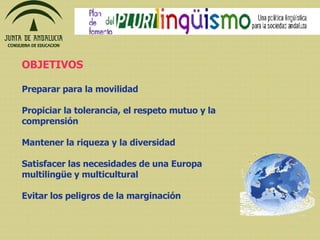 El documento describe el currículo integrado de las lenguas, cuyos objetivos son preparar para la movilidad, fomentar la tolerancia y comprensión interculturales, y satisfacer las necesidades de una Europa multilingüe. Propone un enfoque basado en la competencia plurilingüe y pluricultural del individuo. El currículo integrado diversifica los niveles de competencia, tipos de competencias y discursos en cada lengua, para fundamentar el plurilingüismo.