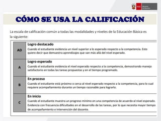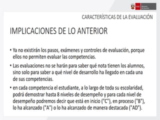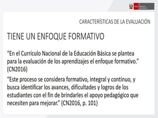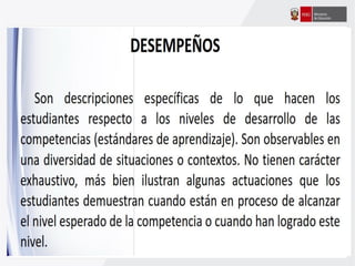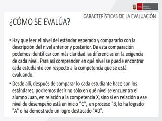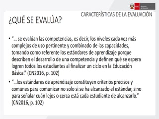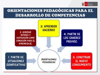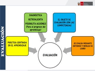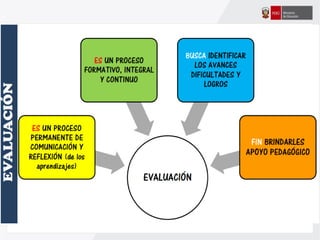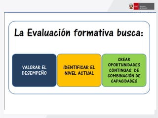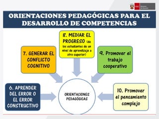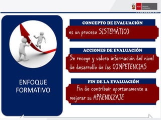 Este documento ofrece orientaciones pedagógicas para desarrollar competencias en los estudiantes asumiendo un enfoque formativo de evaluación. Se propone utilizar la evaluación para mejorar el aprendizaje de los estudiantes mediante la retroalimentación oportuna y la identificación de fortalezas y áreas de mejora, en lugar de usarla solo para calificarlos.
