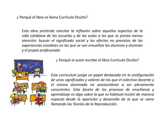 El libro Currículo Oculto pretende reflexionar sobre los aspectos cotidianos de la vida escolar que reciben menos atención y sus efectos no previstos en los estudiantes y profesores. El autor escribe el libro para analizar cómo el currículo oculto configura significados y valores de los que el profesorado y estudiantes no son plenamente conscientes. El libro está estructurado en nueve capítulos que analizan temas como la ideología, la reproducción social, la discriminación de género y raza, y la educ
