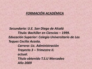 Este documento presenta los datos personales, formación académica y experiencia laboral de Rutt Marine Canchica. Posee 29 años de edad, es venezolana y reside en San Diego de Los Altos, Miranda. Estudió bachillerato en ciencias y obtuvo un título de técnico superior universitario en mercadotecnia. Actualmente cursa la carrera de administración. Trabajó como encargada en una agencia de festejos entre 2003 y 2005. Sus metas son graduarse en administración, crear su propia empresa, construir su casa,