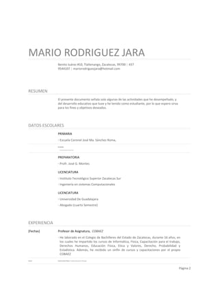 El documento presenta la solicitud de Mario Rodríguez Jara para inscribirse como candidato a consejero estatal del Partido Acción Nacional en Zacatecas. Rodríguez Jara indica haber acreditado satisfactoriamente la evaluación como aspirante al consejo estatal y solicita al presidente del comité directivo municipal su inscripción en la asamblea que se llevará a cabo el 14 de septiembre de 2013, adjuntando su currículum vitae y carta de derechos a salvo.