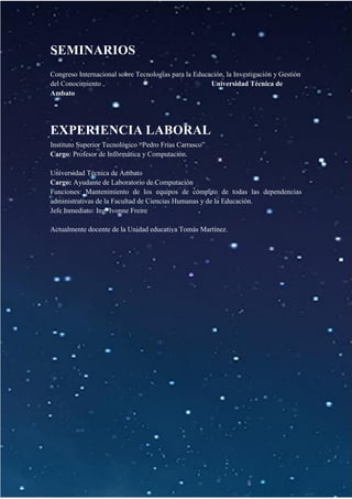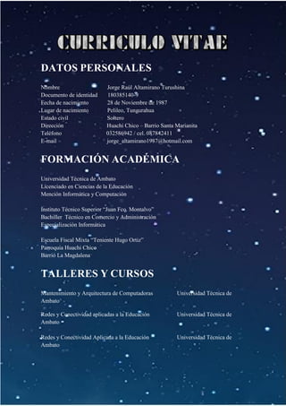 Jorge Altamirano es un profesor de informática ecuatoriano nacido en 1987 en Pelileo, Tungurahua. Se graduó de la Universidad Técnica de Ambato con una licenciatura en ciencias de la educación con énfasis en informática y computación. Ha tomado varios cursos y talleres relacionados con redes, computadoras y tecnología educativa. Actualmente enseña en la Unidad Educativa Tomás Martínez después de haber trabajado como profesor de informática en el Instituto Superior Tecnológico Pedro Frías