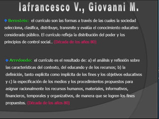 Este documento presenta una discusión sobre el currículo y la educación. Explora diferentes concepciones de currículo, los componentes del currículo como objetivos, contenidos, estrategias y evaluación. También examina los diferentes niveles de concreción del currículo, incluidos el nivel institucional, plan de estudios, programa de materia y plan de clase. Finalmente, analiza conceptos como competencias, contenidos conceptuales, procedimentales y actitudinales.