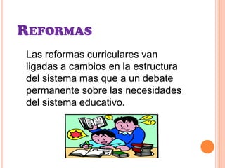 El documento analiza el currículum educativo y las reformas asociadas. Discute que las reformas curriculares suelen estar ligadas a cambios estructurales del sistema más que a debates sobre las necesidades educativas. También menciona la teoría de Bernstein sobre cómo el currículum refleja la distribución del poder social y principios de control, y analiza aspectos como la relevancia del contenido y los puntos débiles del currículum.