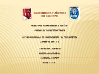 El documento es un currículum vitae de Álvaro Dávila, un estudiante de segundo semestre de Ingeniería Mecánica en la Universidad Técnica de Ambato. Incluye sus datos personales, formación académica, habilidades, destrezas y referencias personales. Actualmente, no tiene experiencia laboral ya que se dedica a sus estudios y sus gastos son cubiertos por sus padres.