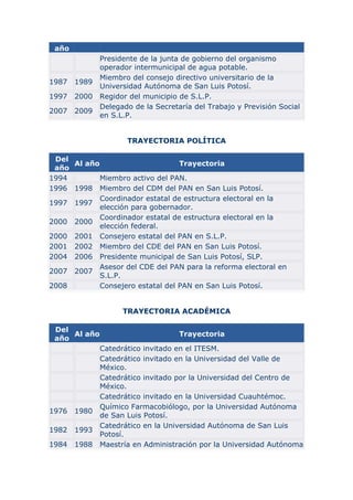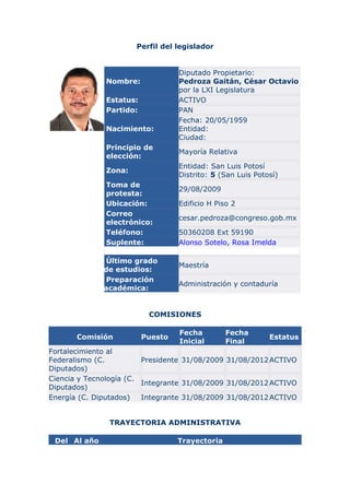 El documento presenta el perfil del diputado César Octavio Pedroza Gaitán del PAN por el estado de San Luis Potosí. Ha sido presidente municipal de San Luis Potosí, miembro de organizaciones empresariales y académicas, y se ha desempeñado en cargos políticos, administrativos y de gestión empresarial en San Luis Potosí. Actualmente es diputado federal y miembro activo de tres comisiones legislativas.