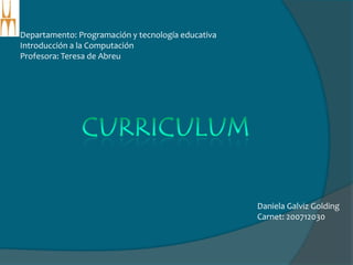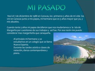 Este documento presenta un resumen biográfico de Daniela GalvizGolding. Detalla su historia de crecimiento en Margarita, Venezuela y sus experiencias educativas allí. También describe su año como estudiante de intercambio en Wasilla, Alaska, Estados Unidos, donde asistió a la escuela secundaria y conoció la cultura local. Actualmente, Daniela está estudiando Estudios Liberales en la Universidad Metropolitana en Caracas y planea continuar sus estudios en política internacional.
