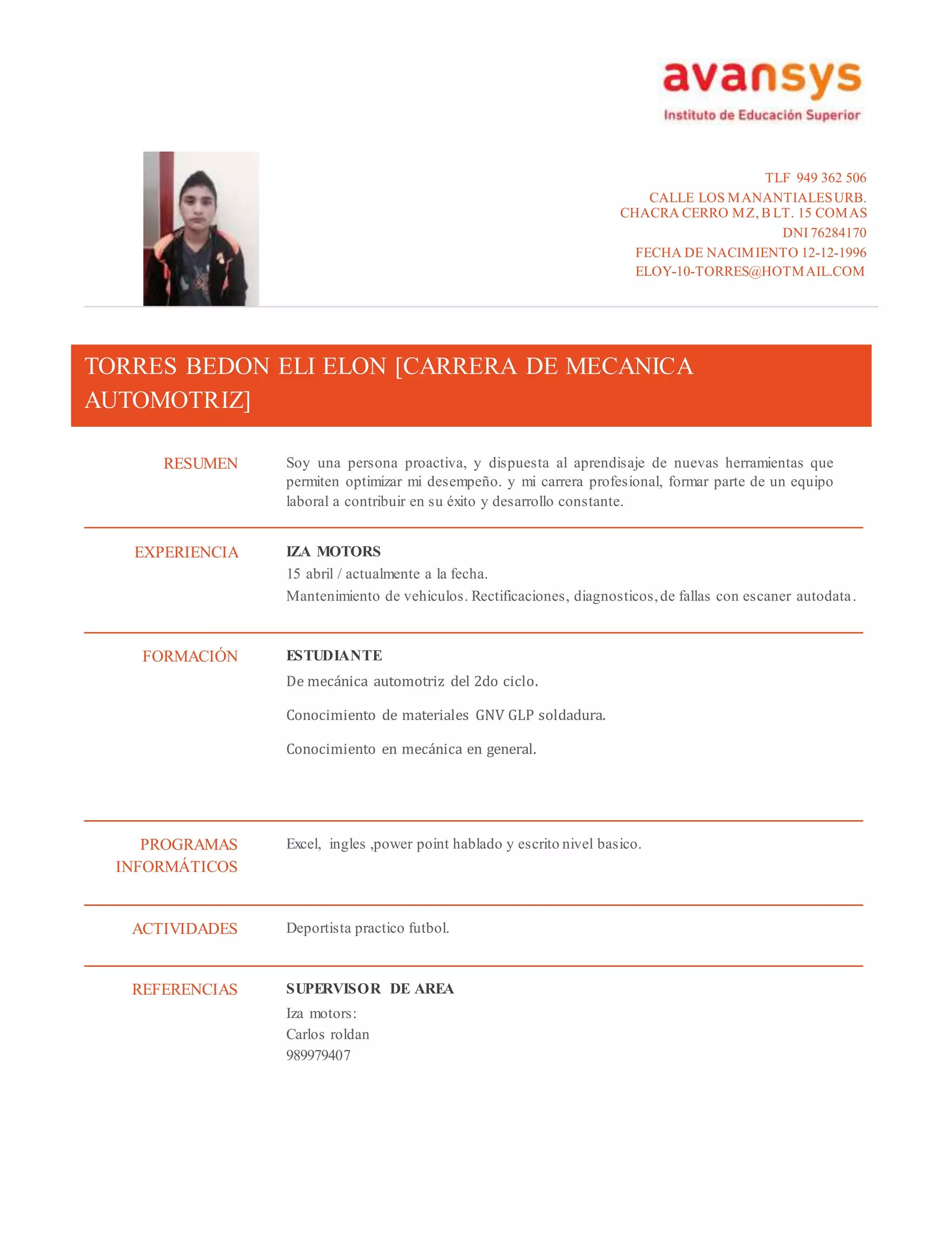 Eloy Torres Bedon es un estudiante de mecánica automotriz nacido en 1996 que actualmente trabaja realizando mantenimiento de vehículos en Iza Motors, incluyendo rectificaciones, diagnósticos de fallas y uso de escáneres Autodata. Está buscando nuevas oportunidades para aplicar sus conocimientos de mecánica en general, materiales GNV y GLP, y soldadura, así como sus habilidades básicas en programas informáticos como Excel, PowerPoint e inglés.