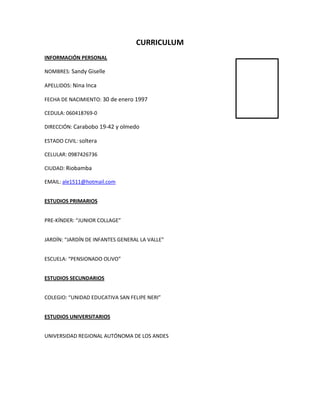 La candidata se llama Sandy Giselle Nina Inca, nació el 30 de enero de 1997 en Riobamba, Ecuador. Completó sus estudios primarios en el Junior Collage, Jardín de Infantes General La Valle y el Pensionado Olivo, y sus estudios secundarios en la Unidad Educativa San Felipe Neri. Actualmente cursa estudios universitarios en la Universidad Regional Autónoma de los Andes.