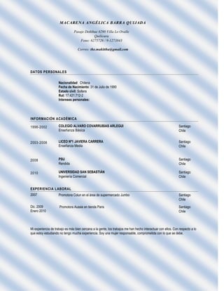 Este documento presenta los datos personales y la información académica y laboral de Macarena Angélica Barra Quijada. Incluye su nacionalidad chilena, fecha de nacimiento en 1990, estado civil de soltera, y estudios en el Liceo No1 Javiera Carrera y la Universidad San Sebastián donde estudia Ingeniería Comercial. También resume su experiencia laboral promocionando productos para Jumbo y Paris.